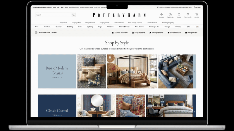 In 2025, Pottery Barn’s digital shopping ecosystem included tools such as Shop by Style, Design Boards, and Room Planner, each designed to help customers discover products, curate mood boards, and visualize furniture in their homes.